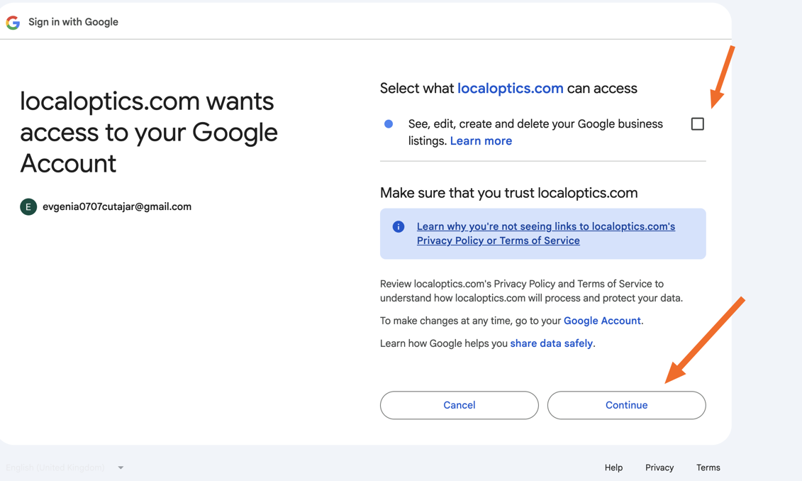 ⚠️ Important: LocalOptics requires these permissions to read and manage your Google Business Profile data. Without granting the necessary permissions, the connection will not complete successfully.