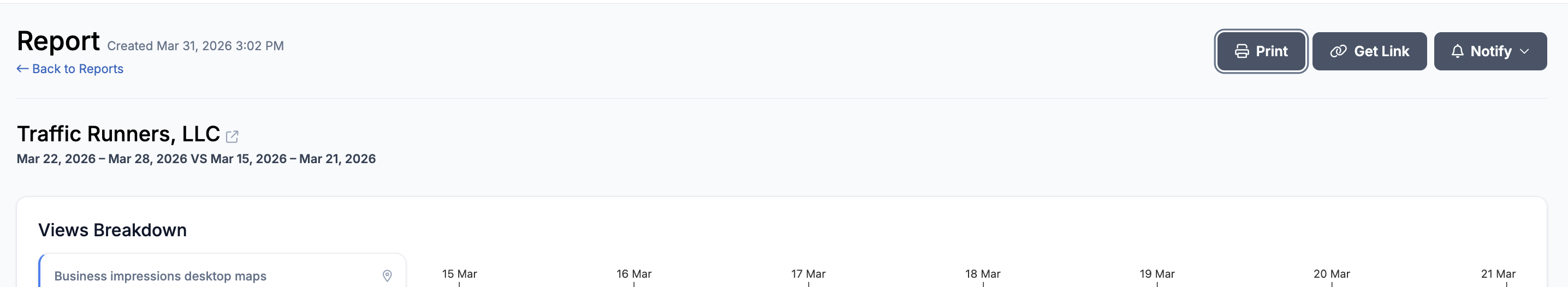 A LocalOptics report is an automatically generated performance summary for a single location, covering a specific time period. It compares your current period against the previous period — so you can immediately see whether performance is improving, declining, or staying flat.