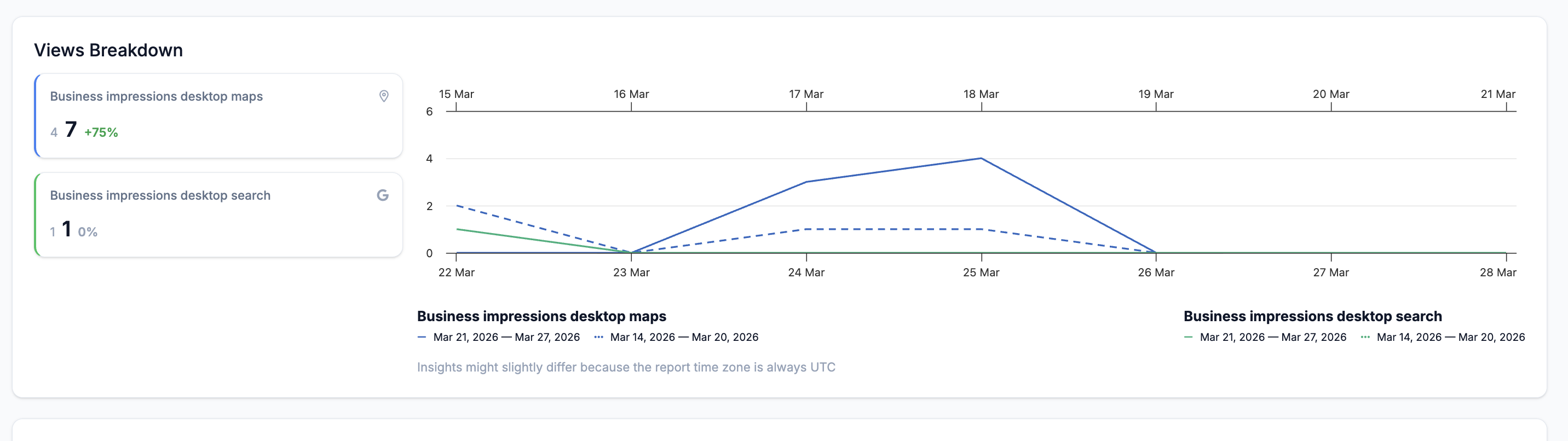 The Views Breakdown section shows how many times your Google Business Profile was seen — broken down by device and surface. Each metric shows the current period value, the previous period value, and the percentage change between them.