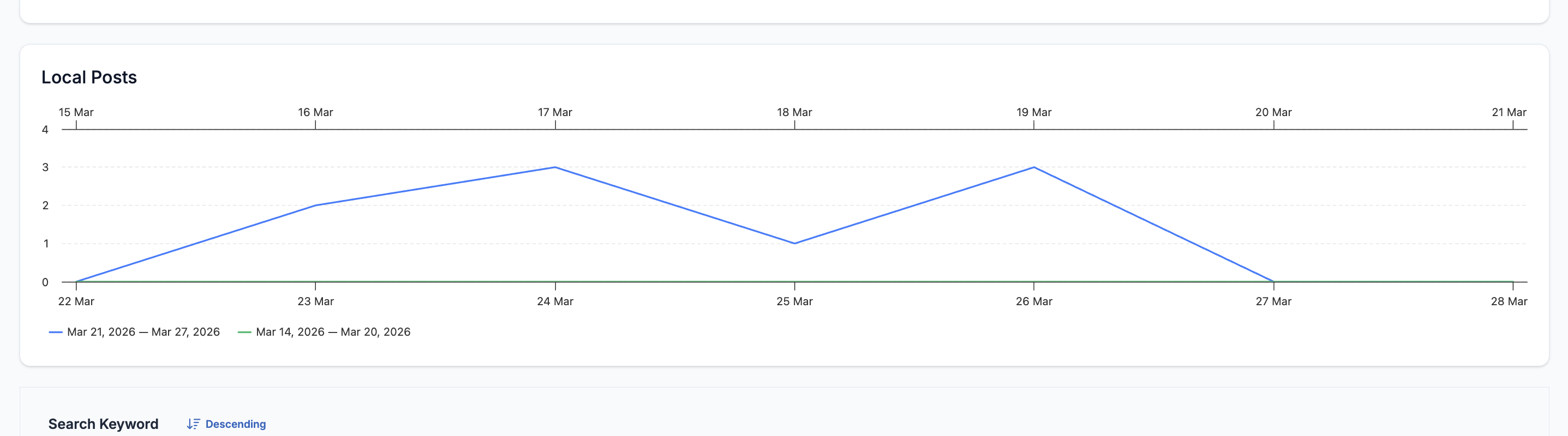 This section shows your Google Business Profile post activity over the reporting period, displayed as a line chart comparing the current and previous period.