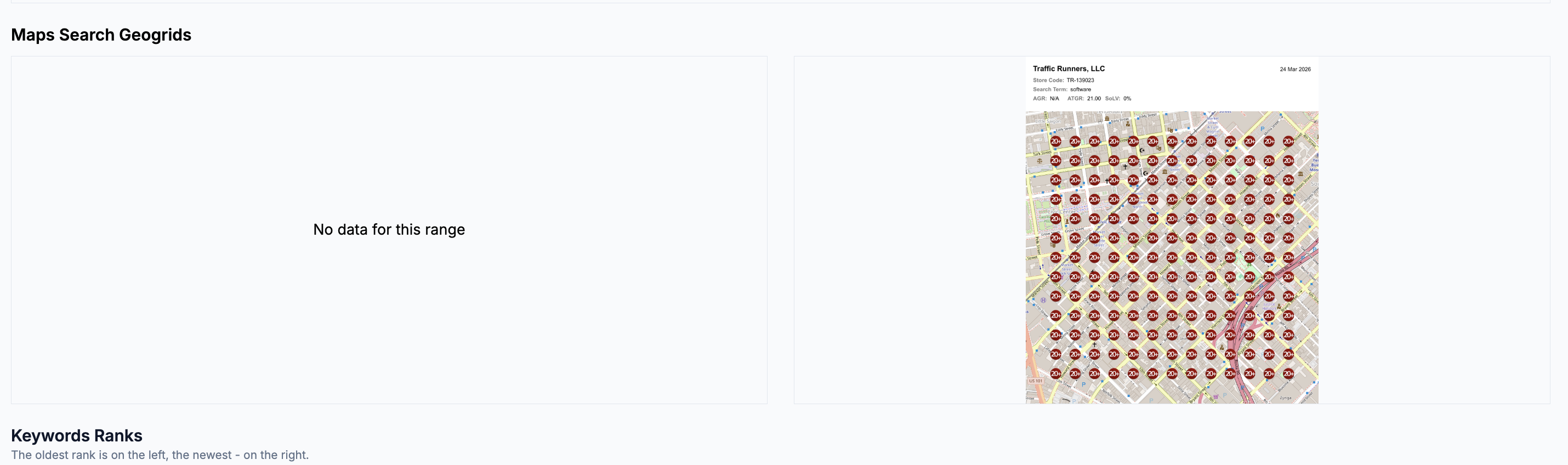If the GeoGrid shows "No data for this range" This means no GeoGrid was run for this location during the reporting period. To include GeoGrid data in future reports, make sure a Scheduled GeoGrid is set up and linked to this report configuration.