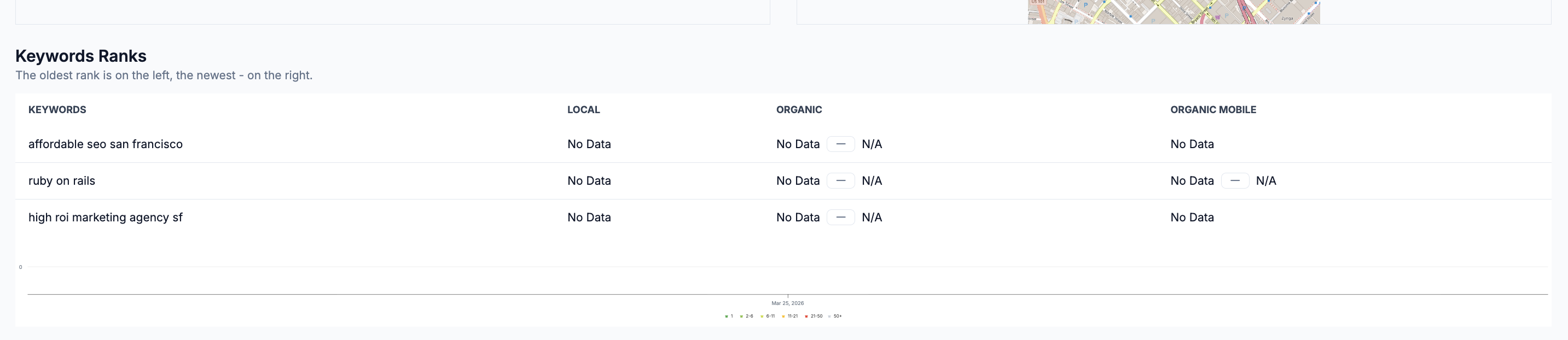This section tracks your website's organic search rankings for specific keywords over time. Rankings are shown from oldest on the left to newest on the right — giving you a clear view of whether your keyword positions are improving.