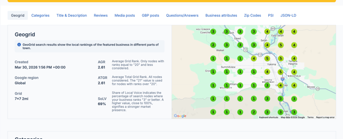 | SoLV | Share of Local Voice — the % of nodes where you rank in the top 3 |