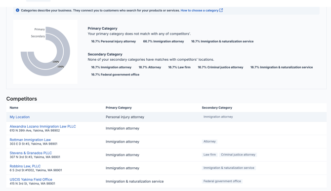 This section compares your primary and secondary Google Business Profile categories against those of your competitors.