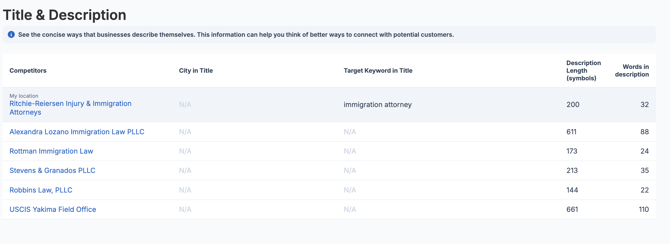 A longer, keyword-rich description gives Google more signals about what your business offers. If competitors are using significantly more words or including keywords you're not, this section shows you exactly where to focus.