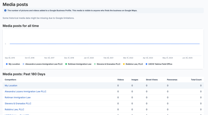 You'll see both all-time media history and a past 180-day comparison. If competitors have significantly more photos than your business, adding more high-quality images is one of the quickest ways to close the gap.