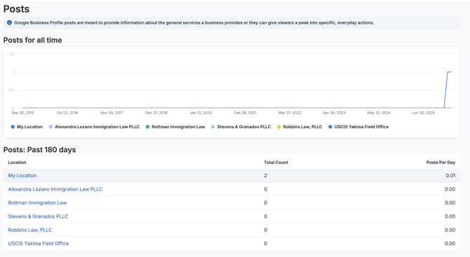 This section compares how frequently you and your competitors are publishing Google Business Profile posts, including: