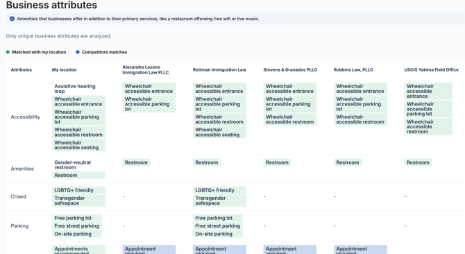 Attributes are the amenities and features your business offers — things like wheelchair accessible entrance, free parking, appointment required, language assistance, and LGBTQ+ friendly status.