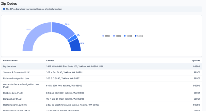 A map and table showing the zip codes where your competitors are physically located. This gives you a geographic overview of the competitive landscape in your area.