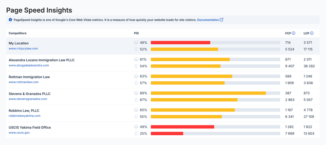 This section shows how quickly your website loads compared to competitors, using Google's Core Web Vitals metrics: