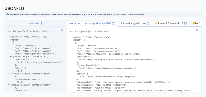 This section of the audit crawls your website and your competitors' websites, extracts the JSON-LD code from each, and displays them side by side so you can compare directly.