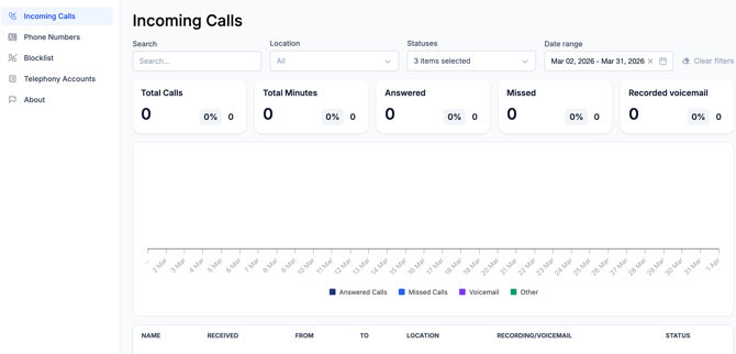 🔵 Statuses Filter by call status — Answered, Missed, Voicemail, or Other. You can select multiple statuses at once. By default all statuses are shown.