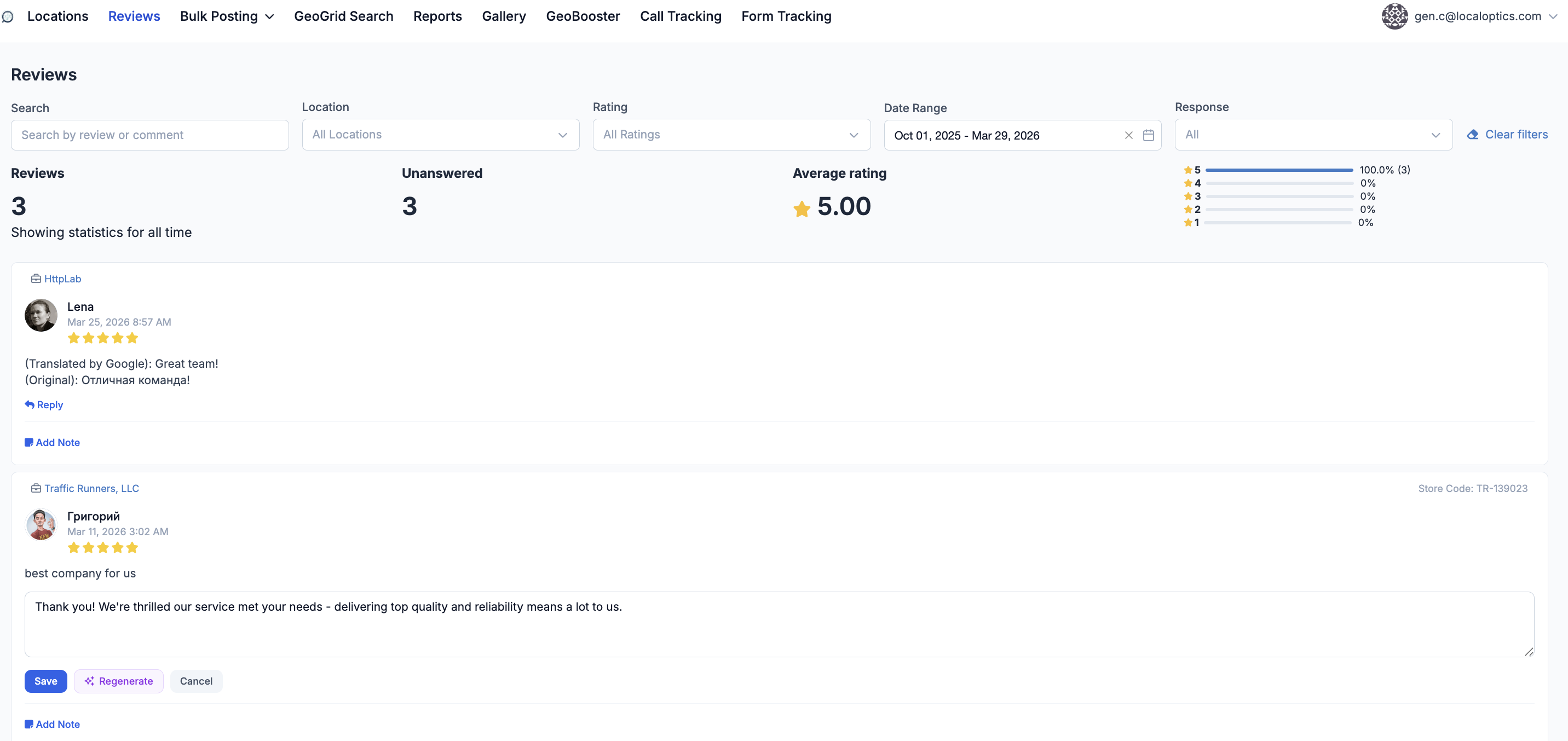 The Reviews section gives you a single view of every customer review across all the locations you manage in LocalOptics — without needing to open each location individually.